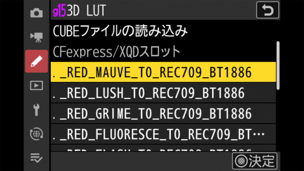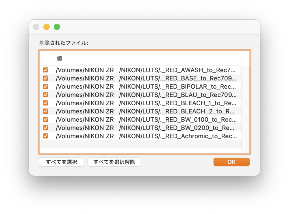 ” ._RED”ではじまるファイルがZRの3D LUT 読み込み時に出ています。これがリソースフォークによる影響のものです。これがあることによって全てのファイルを正しく読み込むことが出来ず、登録出来ない状態になってしまいます。これは、Mac からメモリーカードにcubeファイルを追加する時に出来てしまうようで、カード内に保存したファイルから見えないファイル(リソースフォーク)を削除する必要があります。