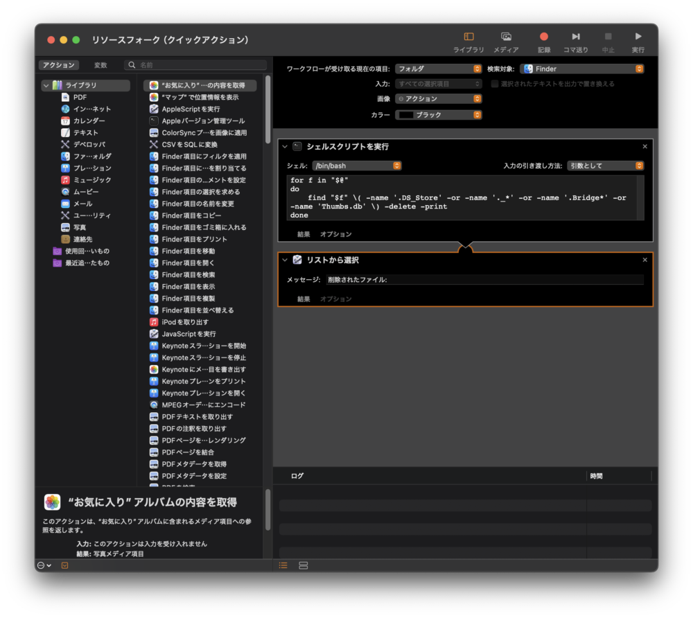 続いて、検索から「シェルスクリプトを実行」を追加し、シェル:/bin/bash、入力の引き渡し方法:引数として にする。