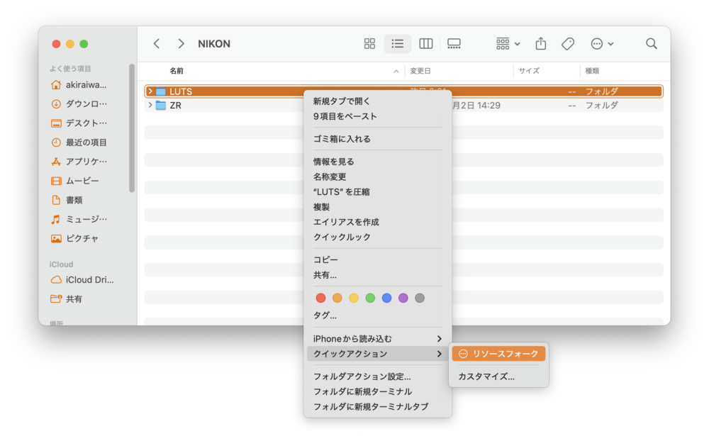 LUTSのフォルダを右クリックし、クイックアクション>リソースフォークをクリック。