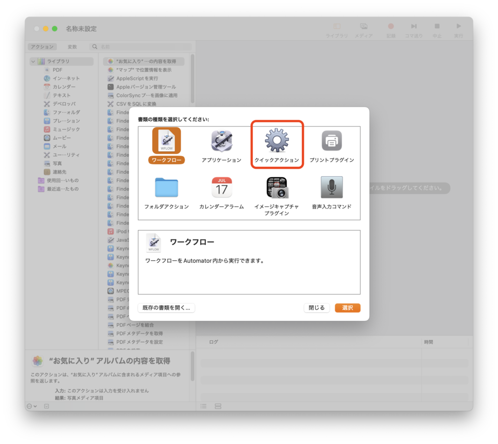 右上のワークフローが受け取る現在の項目:フォルダ、検索対象:Finderに設定。